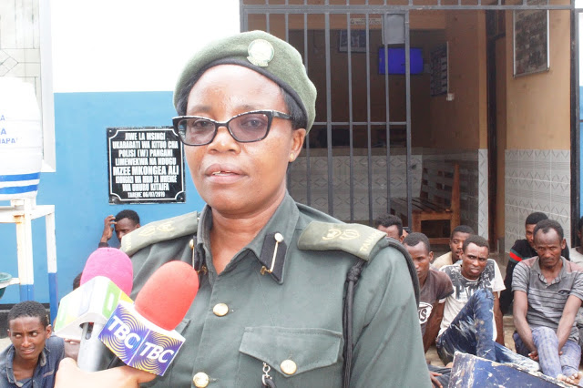 Polisi wilaya ya Pangani (OCD) Georgina Matagi wakiwahoji wahamiaji