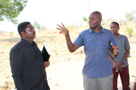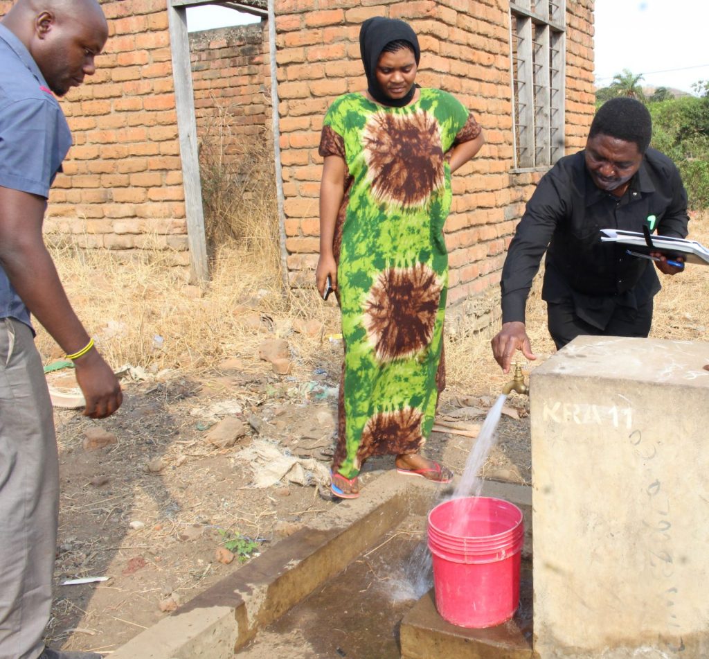 Mkurugenzi Msaidizi, Ufuatiliaji na Tathmini wa Wizara ya Maji Bw. Alex Tarimo (kushoto) akijidhirisha kuhusu upatikanaji wa maji katika kijiji cha Werema, wilayani Tanganyika ambapo wananchi wanapata huduma hiyo katika vizimba 14 vya umma.