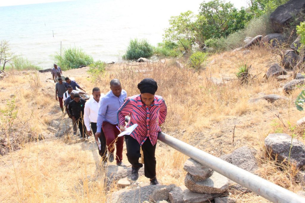 Wataalam wa sekta ya maji wakikagua mfumo unaochukua maji kutoa ziwa Tanganyika katika mrdi wa maji wa kijiji cha Karema. Sehemu ya mradi huo imekamilishwa kwa kuwatumia wataalam wa Wizara ya Maji kupitia utaratibu wa force account.