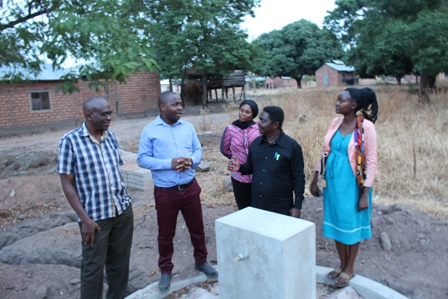 Meneja wa wilaya wa Wakala wa Majisafi na Usafi wa Mazingira Vijijini (RUWASA), wa wilaya ya Tanganyika Mhandisi Alkam Omari (wa pili kushoto), akieleza jitahada zinazofanyika kufikisha maji bombani katika makazi ya wananchi wilayani Tanganyika, mkoa wa Katavi. Hali ya upatikanaji maji vijijini mkoani Katavi inawafikia wananchi kwa asilimia 62 kutoka 51 ya mwaka 2018, ambapo miradi inayoendelea itakapokamilka kiwango hicho kitafika asilimia 85. Wengine ni watendaji katika sekta ya maji nchini.