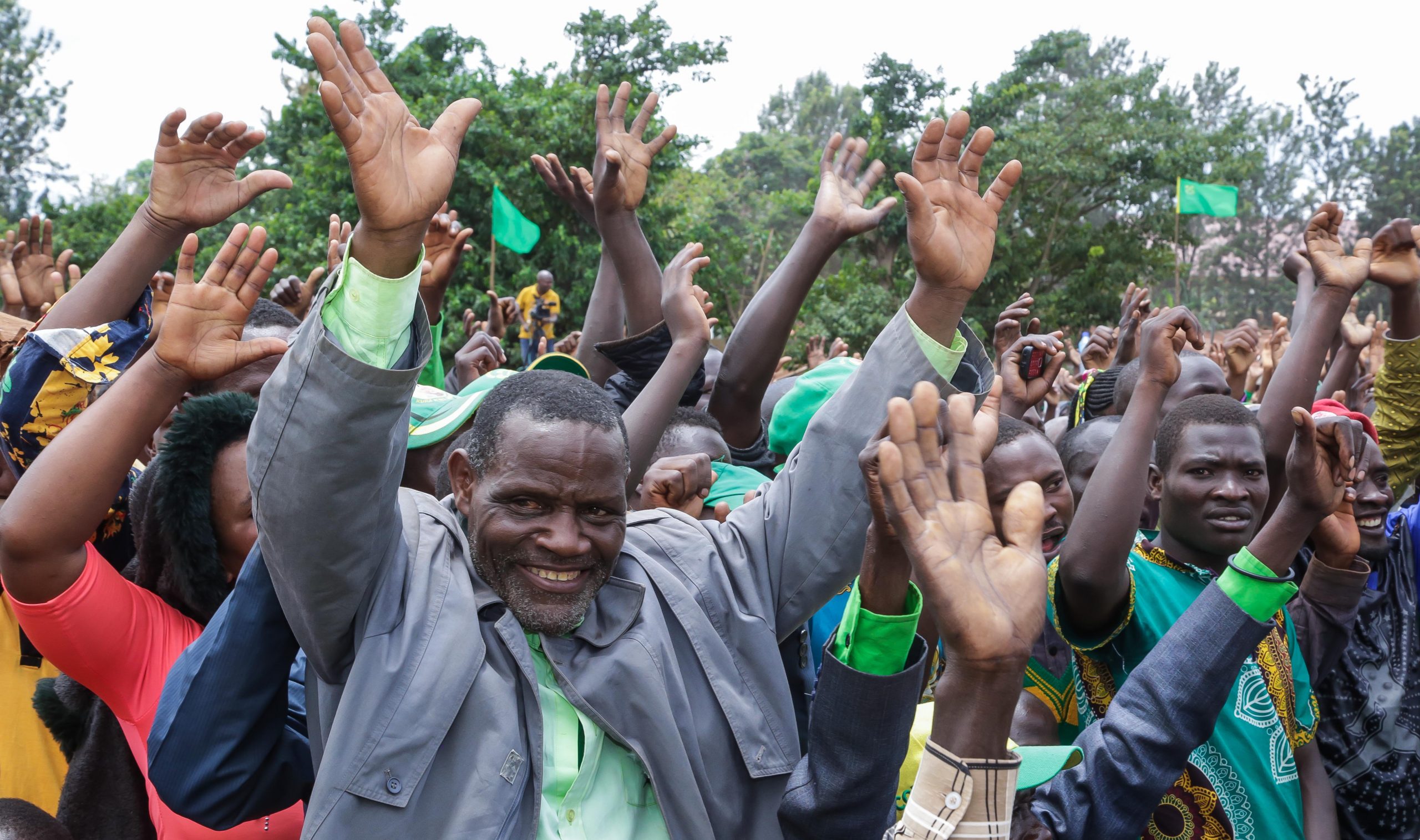 Wananchi wa Kata ya Isingiro, wakimshangilia Mjumbe wa Kamati Kuu, Kassim Majaliwa, wakati akiwahutubia, katika mkutano wa kampeni, uliyofanyika katika viwanja vya Isingiro, wilayani Kyerwa. Septemba 29, 2020. (Picha na Ofisi ya Waziri Mkuu)