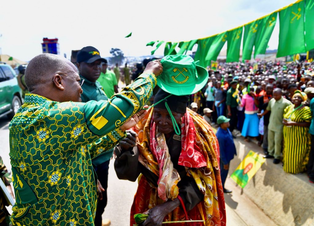 Mgombea Urais kupitia Chama cha Mapinduzi CCM, Rais Mheshimiwa Dkt. John Pombe Magufuli akimvalisha Kofia Bibi aliyefahamika kwa jina moja Bibi Zainabu mara baada ya kuwahutubia wananchi wa Mafinga mkoani Iringa