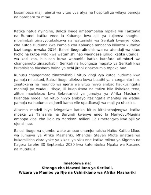 | Katibu Mkuu wa Wizara ya Mambo ya Nje na Ushirikiano wa Afrika Mashariki, Balozi Brig. Gen. Wilbert Ibuge na ujumbe wake wakiwa mpakani mwa Tanzania na Burundi kwenye eneo la Kabanga. |