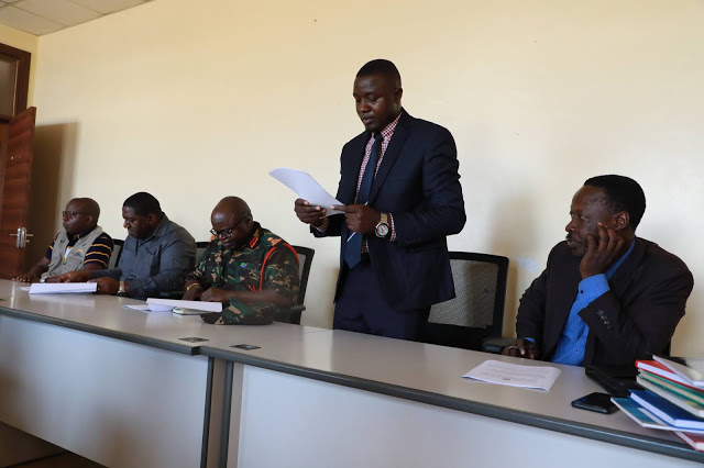 | Katibu Mkuu wa Wizara ya Mambo ya Nje na Ushirikiano wa Afrika Mashariki, Balozi Brig. Gen. Wilbert Ibuge na ujumbe wake wakiwa katika picha ya pamoja na watumishi wa Kituo cha Kutoa Huduma kwa Pamoja cha Kabanga kwenye Mpaka wa Tanzania na Burundi. |
