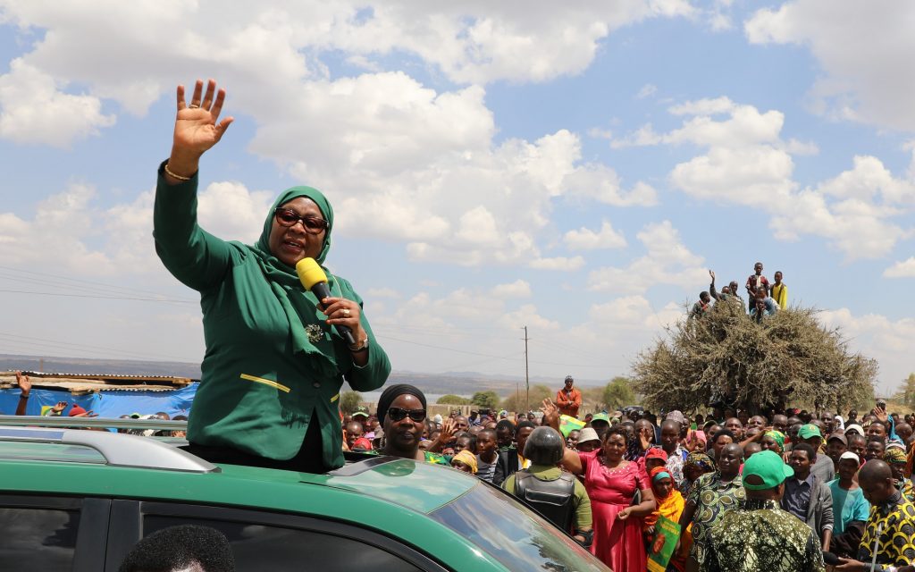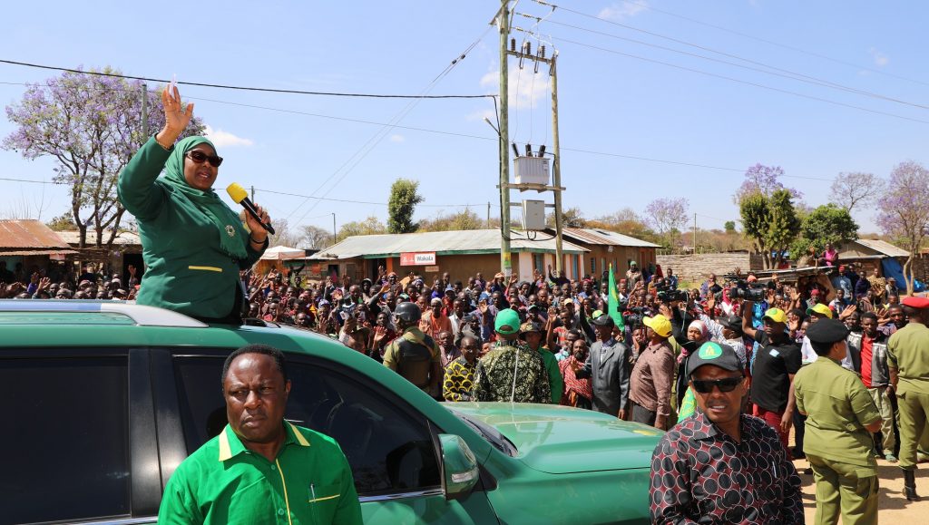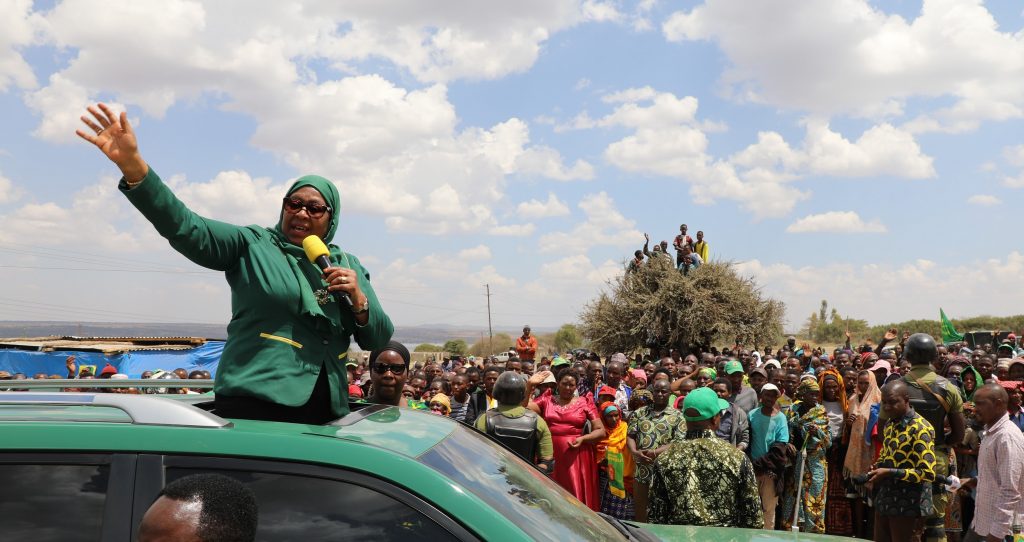 Mgombea Mwenza wa Kiti cha Urais wa Jamhuri ya Muungano wa Tanzania kwa tiketi ya CCM ambae pia ni Makamu wa Rais wa Jamhuri ya Muungano wa Tanzania Mhe. Samia Suluhu Hassan, akisalimiana Wanachama wa Chama cha Mapinduzi CCM na Wananchi wa Kijiji cha Basotu Hanang Mkoani Manyara alipokuwa njiani akielekea Katesh kwa ajili ya kuhutubia mkutano wa kampeni za Chama cha Mapinduzi CCM leo