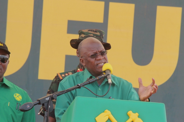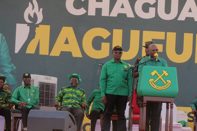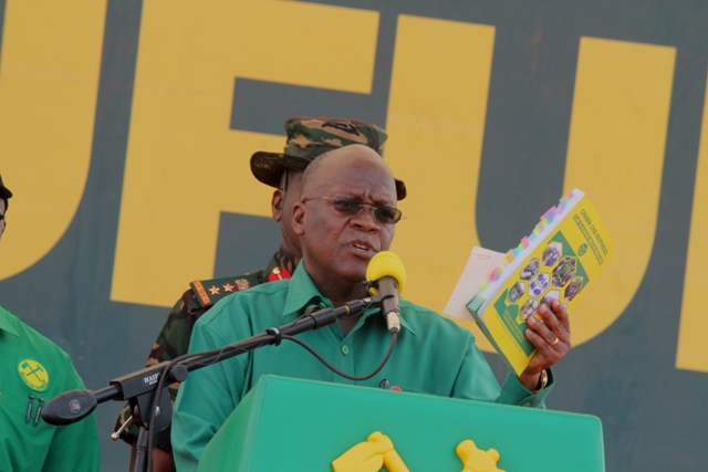 Mgombea Urais wa Jamhuri ya Muungano wa Tanzania kupitia (CCM) Rais Dk. John Pombe Magufuli akionesha ilani ya Uchaguzi ya CCM 2020/2025 wakati akihutubia maelfu ya wananchi waliojitokeza kumsikiliza na kwenye mkutano wa kampeni unaofanyika kwenye uwanja wa Ndege wa zamani jijini Mbeya leo Jumatano Septemba 30.2020.