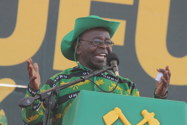 Makamu Mwenyekiti wa CCM Tanzania bara Mzee Philip mangula akizungumzakatika mkutano huo kabla ya mgombea Urais Dk. John Pombe Magufuli kuhutubia maelfu ya wananchi waliojitokezakatika mkutano huo.