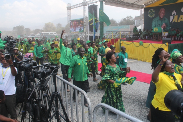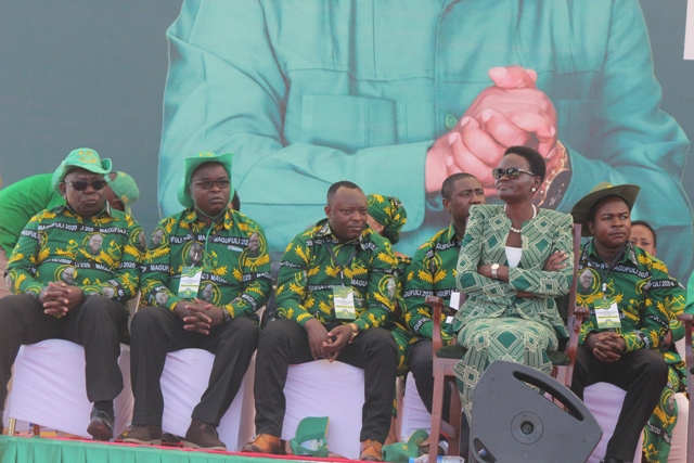 Baadhi ya wagombea ubunge wa mkoa wa Mbeya wakiongozwa na Dk. Tulia Ackson wakiwa wameketi jukwaa kuu.