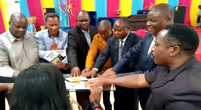 Askofu Mkuu wa Makanisa ya Naioth Gospel Assemblies of God ambaye pia ni Katibu Mkuu mstaafu wa Baraza la Maaskofu wa Kipentekoste Tanzania, Dkt. David Mwasota.(kushot) akiwaongoza Maaskofu na Wachungaji kwenye maombi ya kukiombea Kitabu cha Uongozi Uliotukuka wa Rais wa Jamhuri ya Muungano wa Tanzania, Dkt. John Pombe Magufuli katika hafla ya uzinduzi wa kitabu hicho iliyofanyika jijini Dar es Salaam mwanzoni mwa wiki..