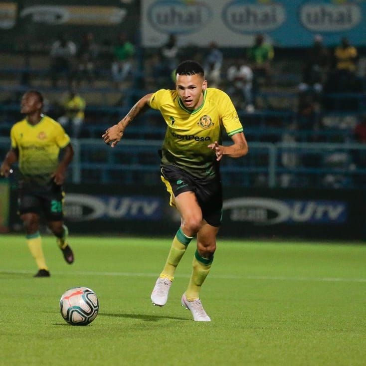 Kiungo Muangola, Carlos Carlinhos akiambaa na mpira kwenye mchezo dhidi ya KMKM leo Chamazi