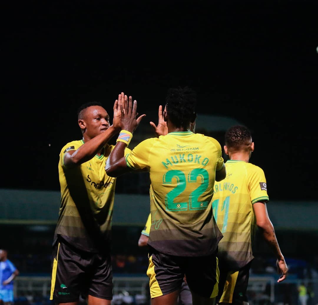 Wachezaji wa Yanga SC wakimpongeza kiungo Mkongo, Tonombe Mukoko baada ya kufunga mabao yote mawili dakika za 11 na 31 katika ushindi wa 2-0 dhidi ya KMKM ya Zanzibar kwenye mchezo wa kirafiki leo Uwanja wa Azam Complex, Chamazi nje kdogo ya Jiji la Dar es Salaam