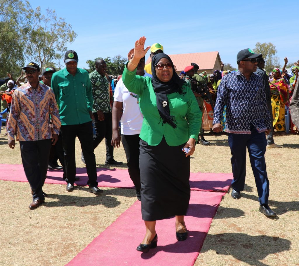 Mgombea Mwenza wa Kiti cha Urais wa Jamhuri ya Muungano wa Tanzania kwa tiketi ya CCM ambae pia ni Makamu wa Rais wa Jamhuri ya Muungano wa Tanzania Mhe. Samia Suluhu Hassan, akisalimiana na Viongozi na Wanachama wa Chama cha Mapinduzi CCM na Wananchi wa Wilaya ya Mkalama alipowasili katika uwanja wa Iguguno Mkalama Mkoani Singida kwa ajili ya kuhutubia mkutano wa kampeni za Chama cha Mapinduzi CCM leo Octoba 02,2020.