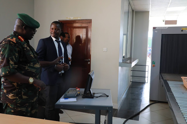 Katibu Mkuu wa Wizara ya Mambo ya Nje na Ushirikiano wa Afrika Mashariki, Balozi Brig. Gen. Wilbert Ibuge akipokelewa na Mkuu wa Kituo cha Huduma kwa Pamoja Mpakani cha Mutukula, alipowasili kwenye kituo hicho kujionea shughuli zinavyoendelea.