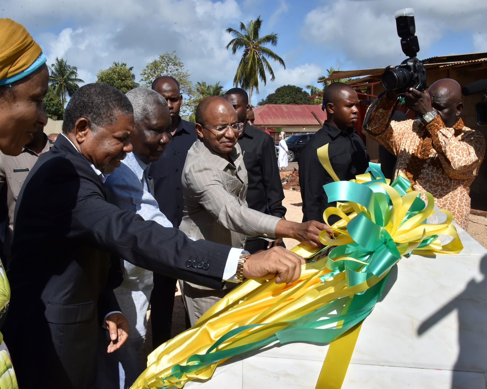 Rais wa Zanzibar na Mwenyekiti wa Baraza la Mapinduzi Dk.Ali Mohamed Shein (kushoto) na Mgombea Urais wa Zanzibar kupitia CCM Dk.Hussein Ali Hassan Mwinyi (kulia) kwa pamoja wakifungua pazia ikiwa ni ishara ya Ufunguzi wa Barabara ya Kombeni-Fuoni iliyojengwa na Kampuni ya “CHINA CIVIL ENGINEERING CORPRATION”(CCECC) kutoka China ambapo Serikali imegharamia ujenzi huo katika hafla iliyofanyika leo Kombeni Wilaya ya Magharibi “B” Mkoa wa Mjini Magharibi(katikati) Makamo wa Pili wa Rais Balozi Sei Ali Iddi.