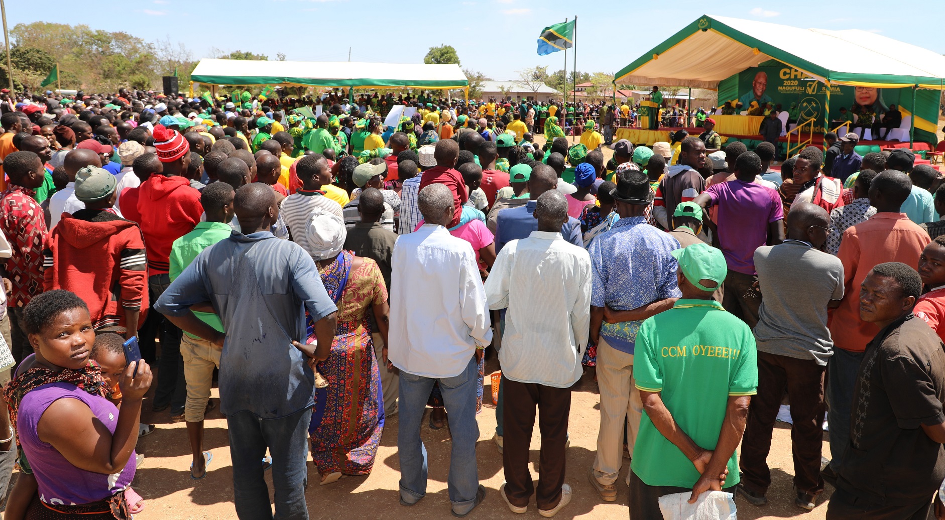 Wanachama wa Chama cha Mapinduzi CCM na Wananchi wa Jimbo la Manonga Nkinga Tabora wakimsikiliza Mgombea Mwenza wa Kiti cha Urais wa Jamhuri ya Muungano wa Tanzania kwa tiketi ya CCM ambae pia ni Makamu wa Rais wa Jamhuri ya Muungano wa Tanzania Mhe. Samia Suluhu Hassan, alipokuwa akihutubia mkutano wa kampeni za Chama cha Mapinduzi CCM katika uwanja wa Ngege Nkinga Mkoani Tabora leo Octoba 0,2020.