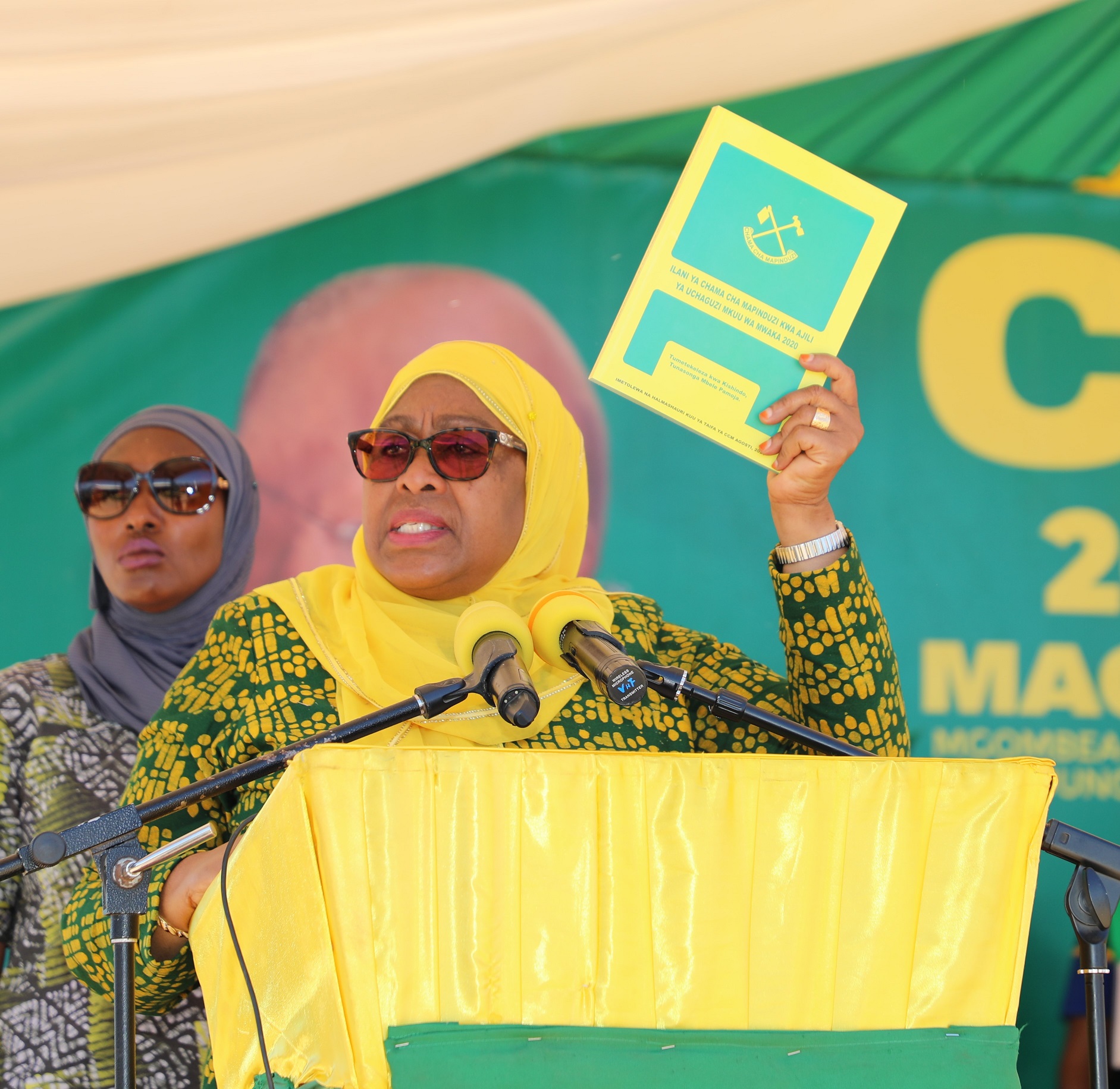Mgombea Mwenza wa Kiti cha Urais wa Jamhuri ya Muungano wa Tanzania kwa tiketi ya CCM ambae pia ni Makamu wa Rais wa Jamhuri ya Muungano wa Tanzania Mhe. Samia Suluhu Hassan, akiinadi Ilani ya Utekelezaji wa CCM 2020/25 kwa Wanachama wa Chama cha Mapinduzi CCM na Wananchi wa Jimbo la Manonga Mkinga kwenye mkutano wa kampeni za Chama cha Mapinduzi CCM uliofanyika katika Uwanja wa Ngege Manonga Wilayani Nkinga Mkoani Tabora leo Octoba 03,2020 .