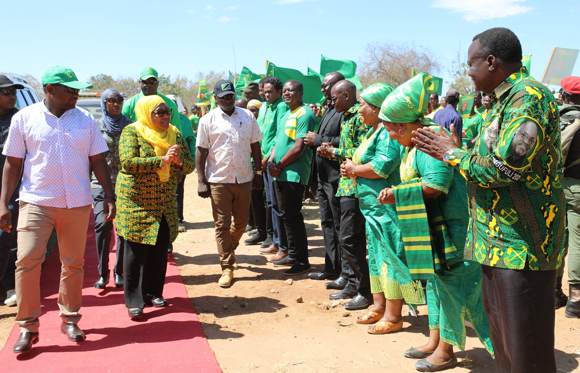 Mgombea Mwenza wa Kiti cha Urais wa Jamhuri ya Muungano wa Tanzania kwa tiketi ya CCM ambae pia ni Makamu wa Rais wa Jamhuri ya Muungano wa Tanzania Mhe. Samia Suluhu Hassan, akisalimiana na Viongozi, Wanachama wa Chama cha Mapinduzi CCM na Wananchi wa Jimbo la Manonga Nkinga alipowasili katika Uwanja wa Ngege Nkinga Mkoani Tabora kwa ajili ya kuhutubia mkutano wa kampeni za Chama cha Mapinduzi CCM leo Octoba 03,2020.