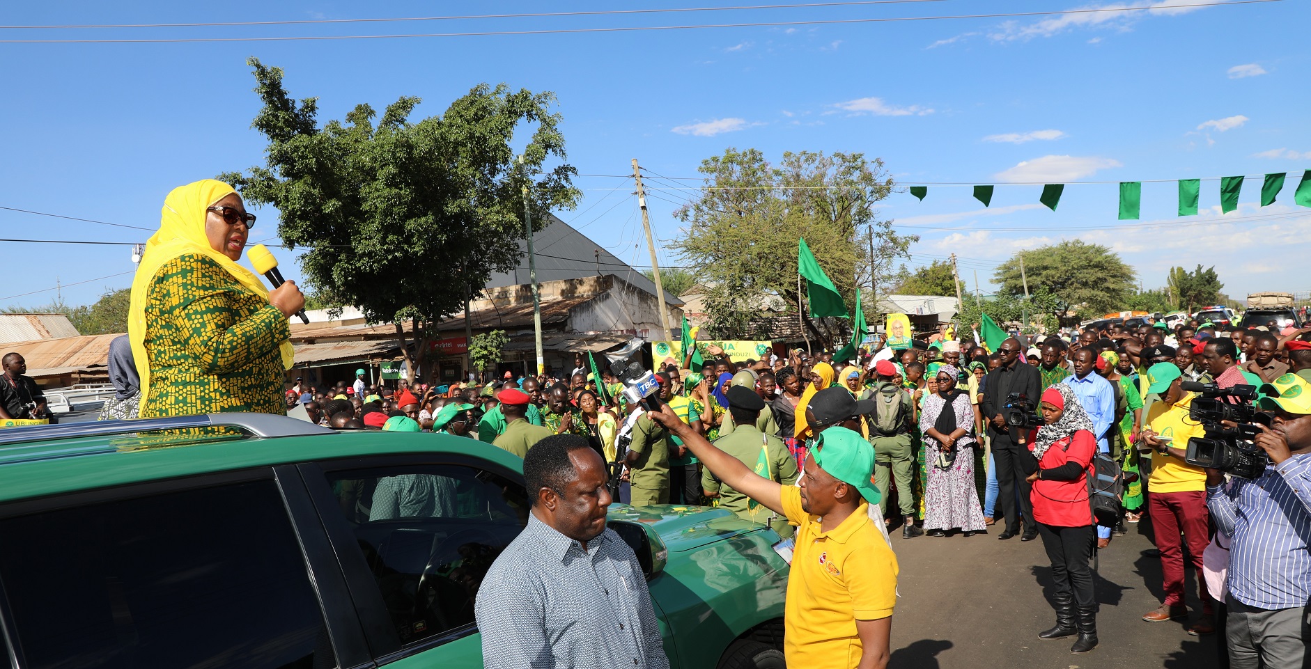 Mgombea Mwenza wa Kiti cha Urais wa Jamhuri ya Muungano wa Tanzania kwa tiketi ya CCM ambae pia ni Makamu wa Rais wa Jamhuri ya Muungano wa Tanzania Mhe. Samia Suluhu Hassan, akiinadi Ilani ya Utekelezaji wa CCM 2020/25 kwa Wanachama wa Chama cha Mapinduzi CCM na Wananchi wa Jimbo la Manonga Mkinga kwenye mkutano wa kampeni za Chama cha Mapinduzi CCM uliofanyika katika Uwanja wa Ngege Manonga Wilayani Nkinga Mkoani Tabora leo Octoba 03,2020 .