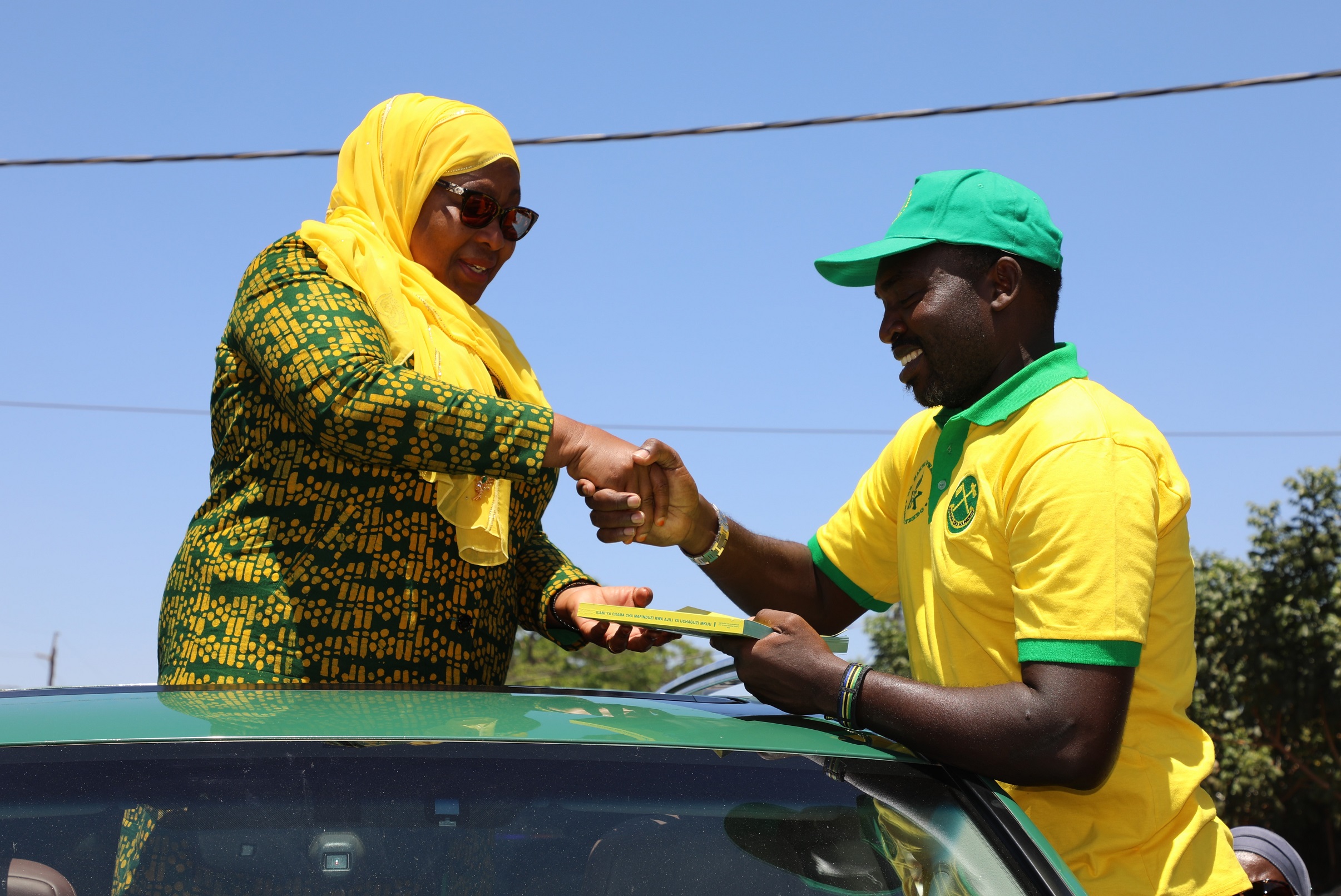 Mgombea Mwenza wa Kiti cha Urais wa Jamhuri ya Muungano wa Tanzania kwa tiketi ya CCM ambae pia ni Makamu wa Rais wa Jamhuri ya Muungano wa Tanzania Mhe. Samia Suluhu Hassan, akisalimiana na kuzungumza na Wanachama wa Chama cha Mapinduzi CCM na Wananchi wa Jimbo la Nzega Vijijini alipokuwa njiani akielekea Wilayani Nzega kuendelea na mikutano wa kampeni za Chama cha Mapinduzi CCM katika Mkoa wa Tabora leo Octoba 03,2020.