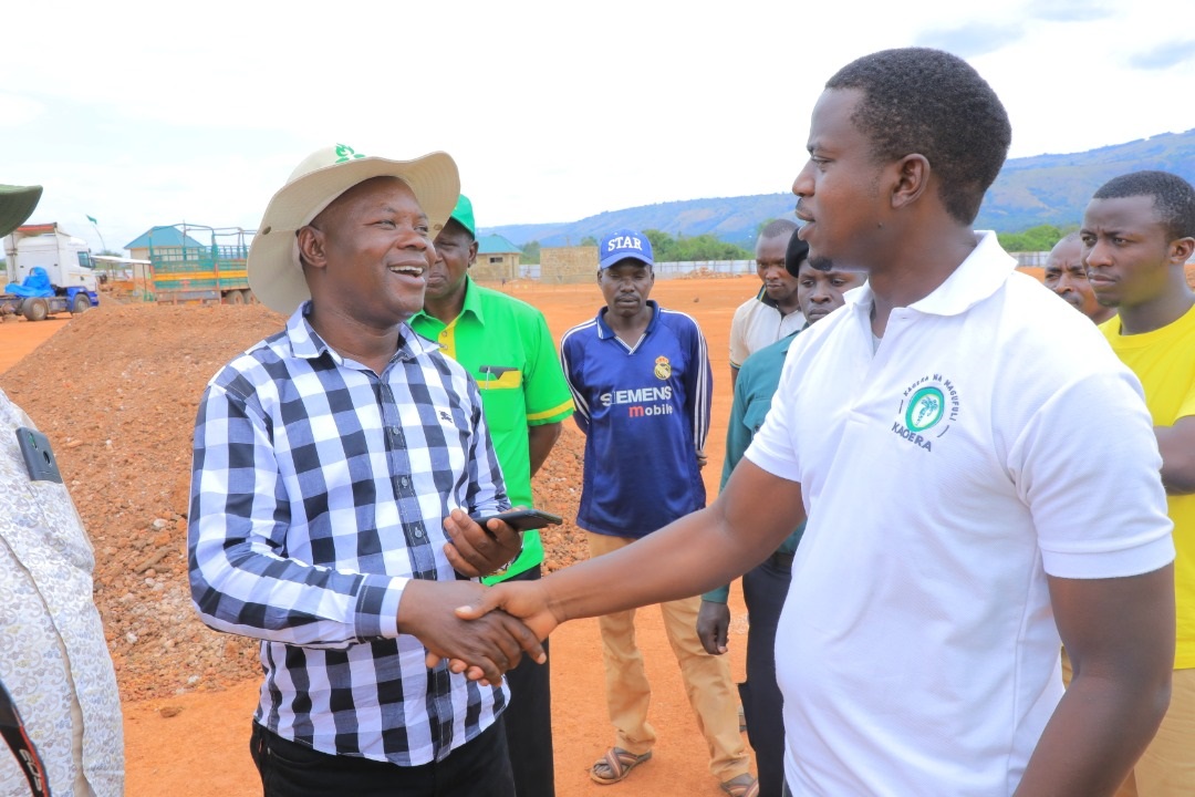Waziri wa Viwanda na Biashara, Mhe. Innocent Bashungwa (kulia) akimpongeza Mkurugenzi wa Kahama Fresh Limited, Jossam Mtangeki kwa kuwekeza katika ujenzi wa kiwanda cha kuchakata maziwa cha Kahama Fresh kitakachokuwa na uwezo wa kuchakata Lita 10,000 kwa mzunguko mmoja na gharama za ujezi mpaka kukamilika ni Billioni 2.4, kinachojengwa eneo maalum la viwanda lililopo Kihanga, wilaya ya Karagwe, Mkoa Kagera. Oktoba 03,2020 (Picha na Eliud Rwechungura)