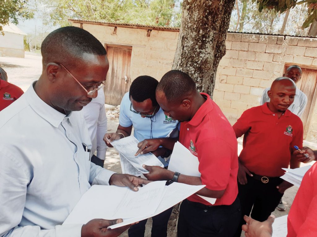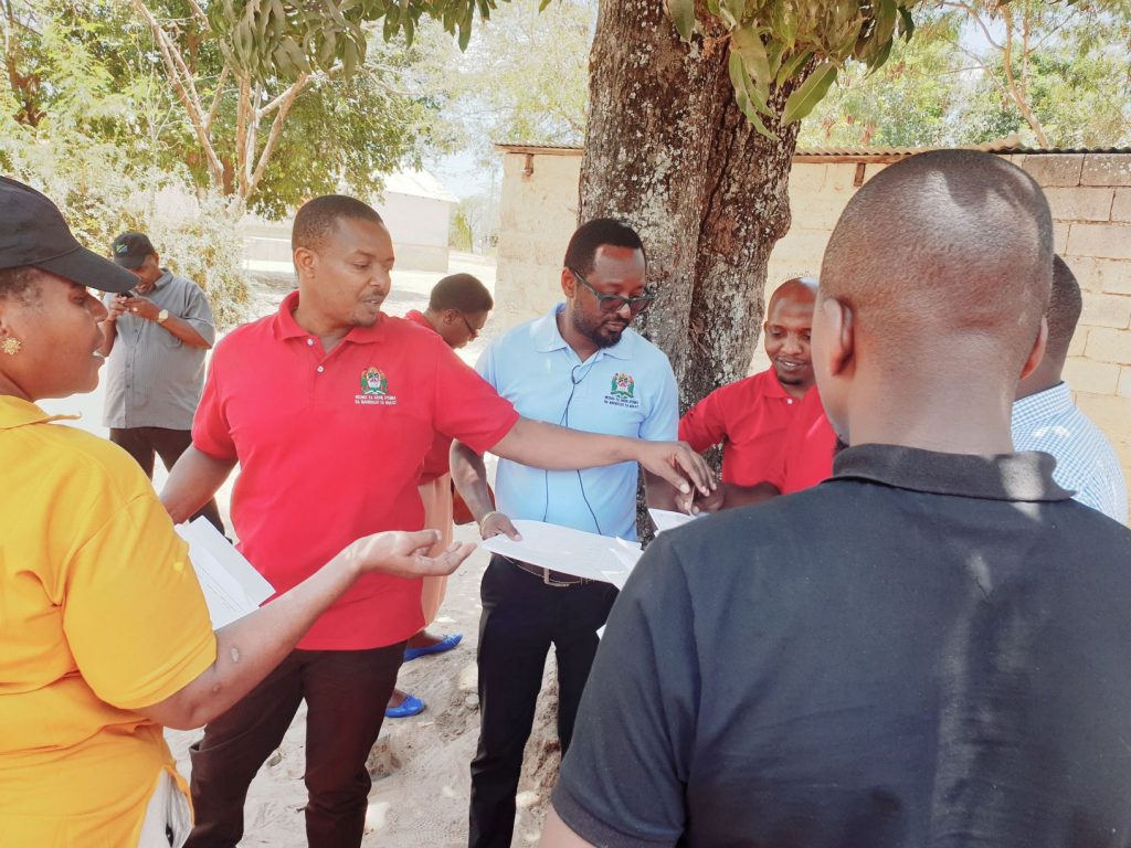 Baadhi ya mofisa kutoka makao makuu Wizara ya Ardhi, Nyumba na Maendeleo ya Makazi wakigawana ramani za upimaji (survey plan) za mtaa wa Majengo katika Halmashauri ya Manyoni kabla ya kuanza kupita nyumba hadi nyumba kutoa elimu kuhusu kodi ya pango la Ardhi.