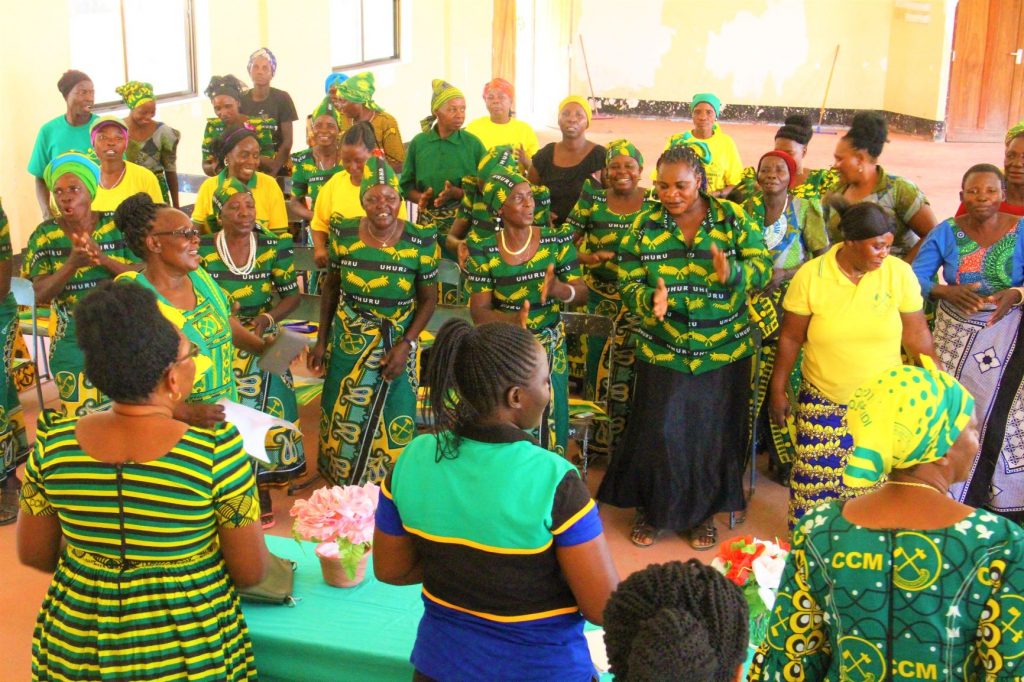 Katibu wa Jumuiya ya Wanawake wa Chama cha Mapinduzi(UWT), Wilaya ya Dodoma, Diana Madukwa (katikati) akiwa wanawake wa Kata ya Mbabala wakiimba wimbo mara baada ya kufanya ziara ya kusaka kura za kishindo kwa mgombea urais wa chama cha mapinduzi (CCM) Dk. John Pombe Magufuli,Mbunge pamoja na madiwani wa kata 41 ili chama hicho kiendelee kushika dola.