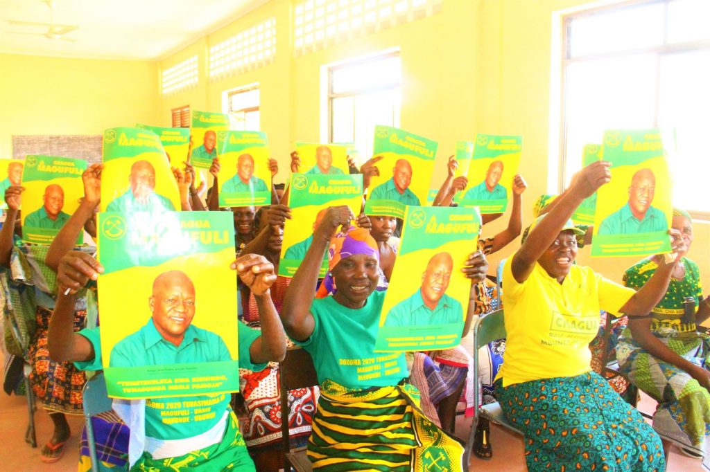 Sehemu ya wanawake wa Kata ya Mbabala wakionyesha mabango yakiwa na Picha ya Mgombea Urais wa ccm Dkt.Magufuli kwa Katibu wa Jumuiya ya Wanawake wa Chama cha Mapinduzi(UWT), Wilaya ya Dodoma, Diana Madukwa (hayupo pichani ) alipofanya ziara ya kusaka kura Kata kwa Kata kwa wagombea wa chama cha mapinduzi (CCM) Dk. John Pombe Magufuli,Mbunge pamoja na madiwani wa kata 41 ili chama hicho kiendelee kushika dola.