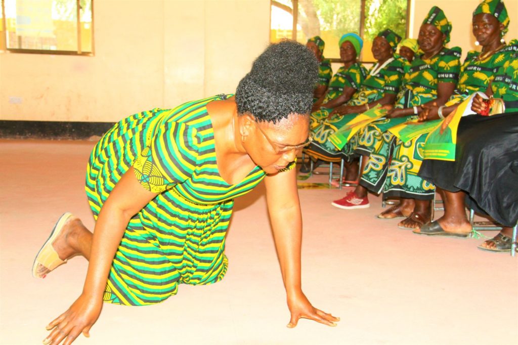 Mjumbe wa Halmashauri Wilaya ya Dodoma ambaye pia ni Mumbe wa Kamati ya Ushindi Bi.Romana Nyoni,akipiga magoti kwa wanawake wa Kata ya Mbabala akiomba kura kwa mgombea udiwani wa Kata hiyo Pascazia Mayala wakati wa kikao cha ndani cha kusaka kura Kata kwa Kata chenye lengo la kupata ushindi wa kishindo kwa wagombea wa CCM.