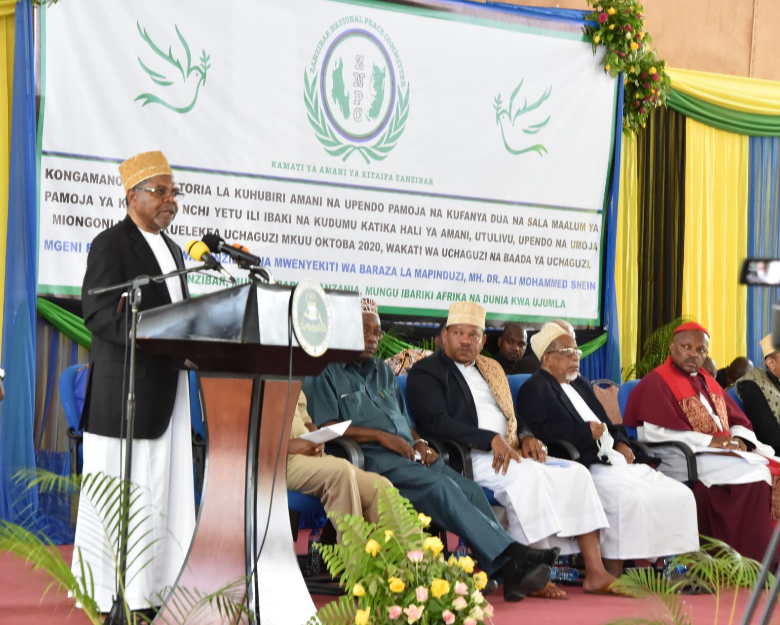 Rais wa zanzibar na Mwenyekiti wa baraka la Mapinduzi Dk.Ali Mohamed Shein akizungumza na Wananchi wa mikoa mitâtu ya Unguja katika Kongamano la Kihistoria la kuhubiri Amani na Upendo pamoja na dua katika ukumbi wa Dk.Ali Mohamed Shein Tunguu Wilaya ya kati Mkoa wa Kusini Unguja Leo