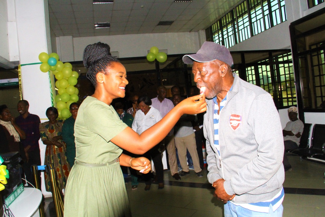 Meneja wa Mkoa Dodoma Frank Chambua akimlisha Keki Mteja aliyefika katika Ofisi hizo kwa ajili ya kuadhimisha wiki ya Huduma kwa wateja .