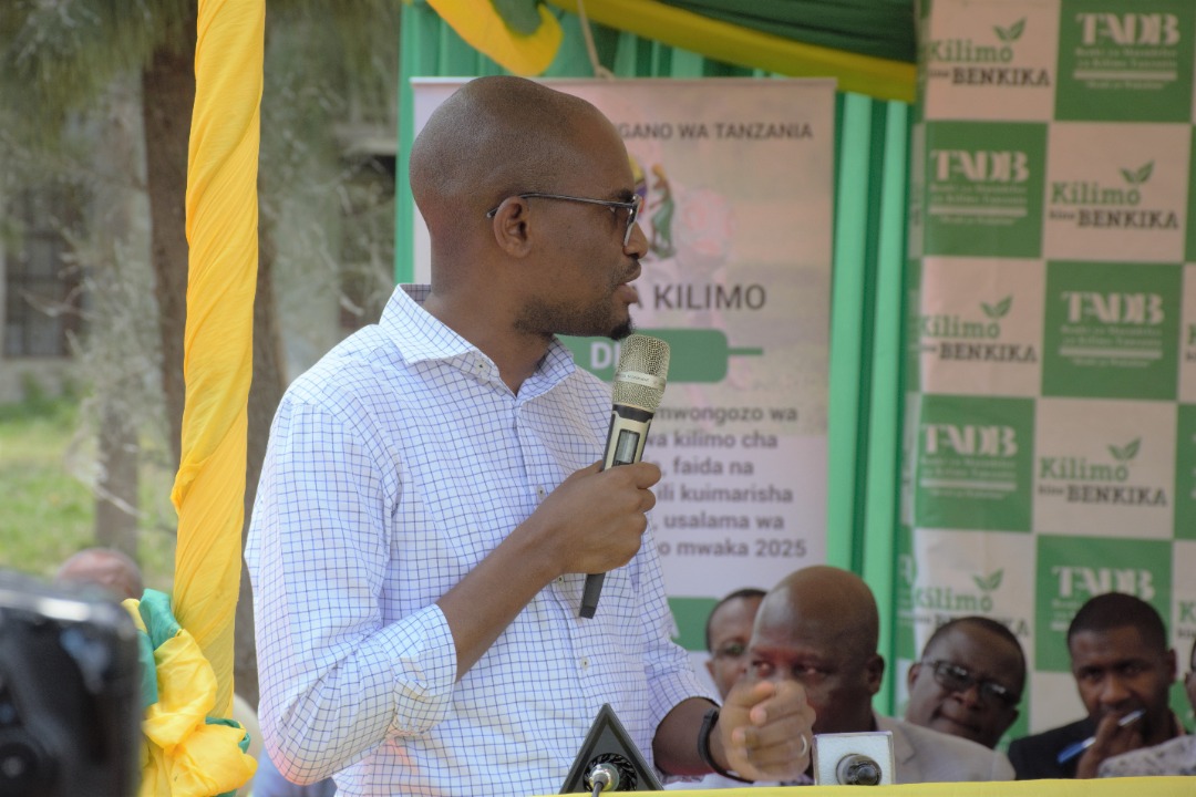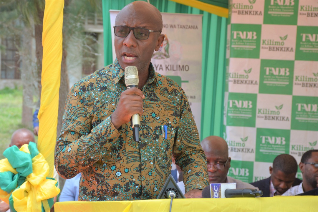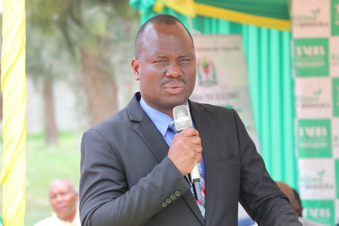 Mkurugenzi Mkuu wa Benki ya Maendeleo ya Kilimo (TADB) Bwana Justine Japhet akihutubia Wanaushirika na Wananchi wa wilaya ya Chato walioshiriki kwenye hafla ya uzinduzi wa Chama Kikuu cha Ushirika Chato mchana leo mchana, tarehe 9 Oktoba, 2020.