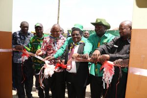 Mkurugenzi Mtendaji wa Kituo cha Uwekezaji wa Tanzania-TIC, Dkt. Maduhu Kazi (wa tatu kulia) akikata utepe kufungua chuo cha ufundi Kasoli iliyojengwa kwa msaada na Mwekezaji wa Kampuni ya Alliance Ginnery na baadaye kukabidhiwa kwa Serikali jana katika Kijiji cha Kasoli wilayani Bariadi mkoani Simiyu.
