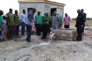Mkurugenzi Mtendaji wa Kituo cha Uwekezaji wa Tanzania-TIC, Dkt. Maduhu Kazi akiyaangalia maji yanayotoka katika kisima kilichochimbwa kwenye shule ya ufundi ya Kasoli iliyojengwa kwa msaada na kampuni Alliance Ginnery na kuikabidhi kwa serikali, baada ya kuifungua chuo hicho jana katika Kijiji cha Kasoli wilayani Bariadi mkoani Simiyu.