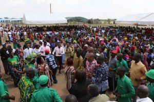 Mkurugenzi Mtendaji wa Kituo cha Uwekezaji wa Tanzania-TIC, Dkt. Maduhu Kazi, Meneja Mkuu wa Alliance Ginnery Limited, Bw. Boaz Ogola, Mkuu wa Mkoa wa Simiyu, Mhe. Anthony Mtaka wakifurahia na wananchi katika kijiji cha Kasoli baada ya ufunguzi wa chuo cha ufundi Kasoli iliyojengwa kwa msaada na kampuni Alliance Ginnery na kuikabidhi kwa serikali jana kijijini hapo.