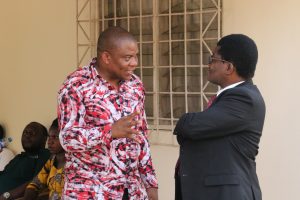 Mkuu wa Mkoa wa Simiyu, Mhe. Anthony Mtaka(kushoto ) akiteta jambo na Mkurugenzi Mtendaji wa Kituo cha Uwekezaji wa Tanzania-TIC, Dkt. Maduhu Kazi mara baada ya makabidhiano ya chuo cha ufundi Kasoli iliyojengwa kwa msaada na kampuni ya Alliance Ginnery na kuikabidhi kwa serikali, katika Kijiji cha Kasoli wilayani Bariadi mkoani Simiyu.