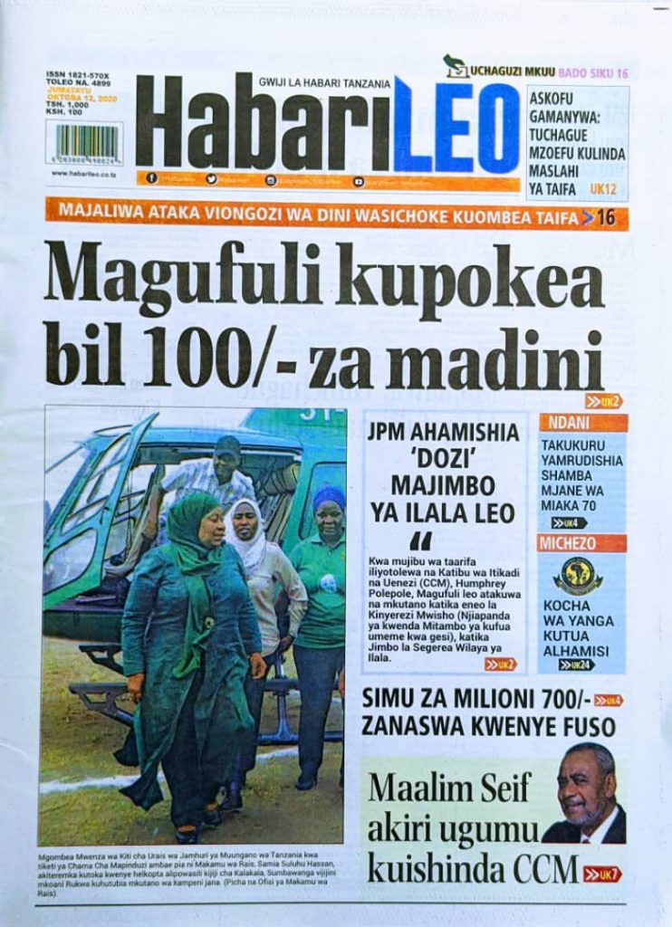 MagazetiPITIA VICHWA VYA HABARI KATIKA MAGAZETI YA LEO OCTOBER 12,2020 Last updated: 2020/10/12 at 2:57 AM Alex Sonna 5 years ago Share SHARE Alex Sonna October 12, 2020 October 12, 2020 Share this Article Facebook Twitter Email Print Previous Article UDHALILISHAJI WA KIJINSIA KWA MTOTO WA KIKE BADO CHANGAMOTO ZANZIBAR Next Article MAJALIWA AZINDUA PROGRAMU YA UGAWAJI WA MBOLEA KWA WAKULIMA