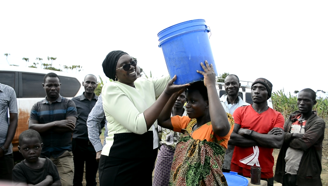 Meneja wa wakala wa maji mjini na vijijini wilaya ya Muleba Mhandisi Jerome Patrick kulia akimtua ndoo ya maji mmoja wa wakina mama wa kitongoji Maizigela.