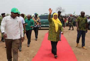 Mgombea Mwenza wa Kiti cha Urais wa Jamhuri ya Muungano wa Tanzania kwa tiketi ya CCM ambae pia ni Makamu wa Rais wa Jamhuri ya Muungano wa Tanzania Mhe. Samia Suluhu Hassan, akisalimiana na Viongozi na Wanachama wa Chama cha Mapinduzi CCM na Wananchi wa Jimbo la Momba alipowasili katika Viwanja vya Nkala Chitete Momba Mkoani Songwe leo Oktoba 13,2020 kwa ajili ya kuhutubia mkutano wa kampeni za Chama cha Mapinduzi CCM.