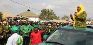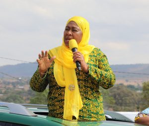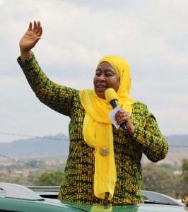 Mgombea Mwenza wa Kiti cha Urais wa Jamhuri ya Muungano wa Tanzania kwa tiketi ya CCM ambae pia ni Makamu wa Rais wa Jamhuri ya Muungano wa Tanzania Mhe. Samia Suluhu Hassan, akisalimiana na Wanachama wa Chama cha Mapinduzi CCM na Wananchi wa kijiji cha Laela Sumbawanga alipokuwa njiani akielekea Mkoani Songwe kuanza ziara ya Kampeni za Chama cha Mapinduzi CCM Mbozi Mkoani Songwe