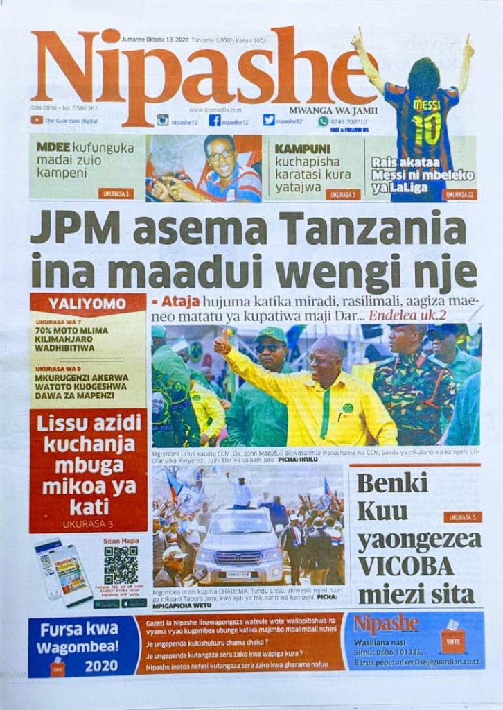 MagazetiPITIA VICHWA VYA HABARI KATIKA MAGAZETI YA LEO OCTOBER 13,2020 Last updated: 2020/10/13 at 3:19 AM Alex Sonna 5 years ago Share SHARE \ Alex Sonna October 13, 2020 October 13, 2020 Share this Article Facebook Twitter Email Print Previous Article KUHUSU TAARIFA YA UPOTOSHAJI KUHUSU MAFAO YA WAFANYAKAZI Next Article WANAWAKE WAHAMASISHWA NAFASI ZA UONGOZI WA USHIRIKA