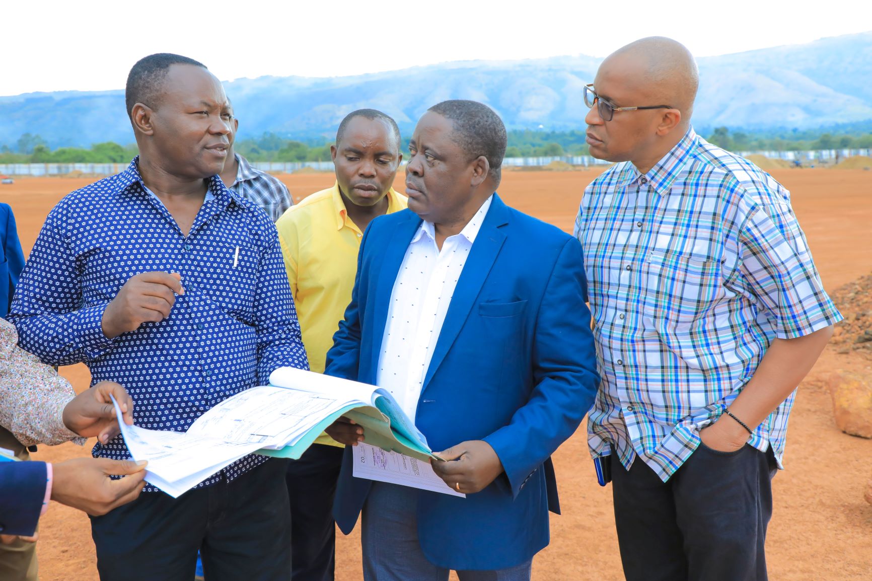 Naibu Katibu Mkuu Wizara ya Viwanda na Biashara Bw. Ludovick Nduhiye (aliyevaa koti) akikagua ramani ya ujenzi wa kiwanda cha kuchakata maziwa cha Kahama Fresh kitakachokuwa na uwezo wa kuchakata Lita 10,000 kwa mzunguko mmoja na gharama za ujezi mpaka kukamilika ni Billioni 2.4, kinachojengwa eneo maalum la viwanda lililopo Kihanga, wilaya ya Karagwe, Mkoa Kagera. Kulia ni Mkurugenzi msaidizi wa EPZA, James Maziku na kushoto ni Mkurugenzi wa Kahama Fresh, Jossam Ntangeki. Oktoba 12,2020