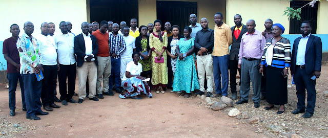 Walimu wakipiga picha ya pamoja na wageni kutoka Wizara tano, mara baada ya kumaliza kikao.