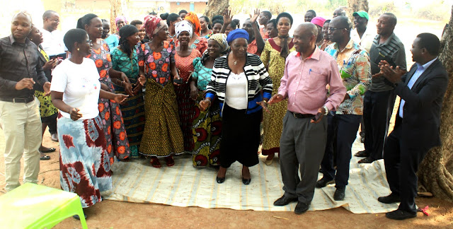 Wageni kutoka Wizara Tano wakifurahi pamoja na wanakikundi cha wanawake na chimbuko la maendeleo kutoka Bukene.