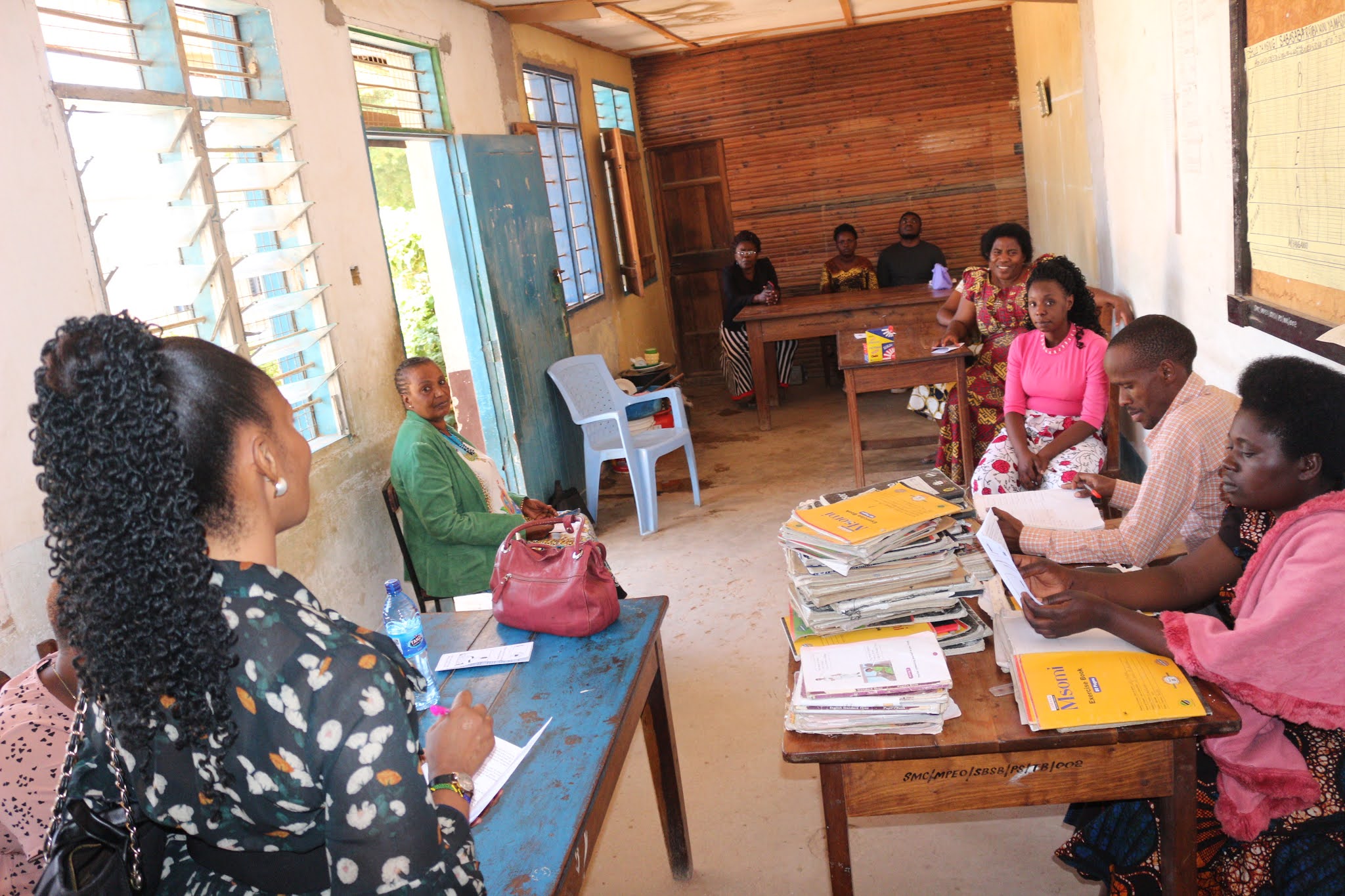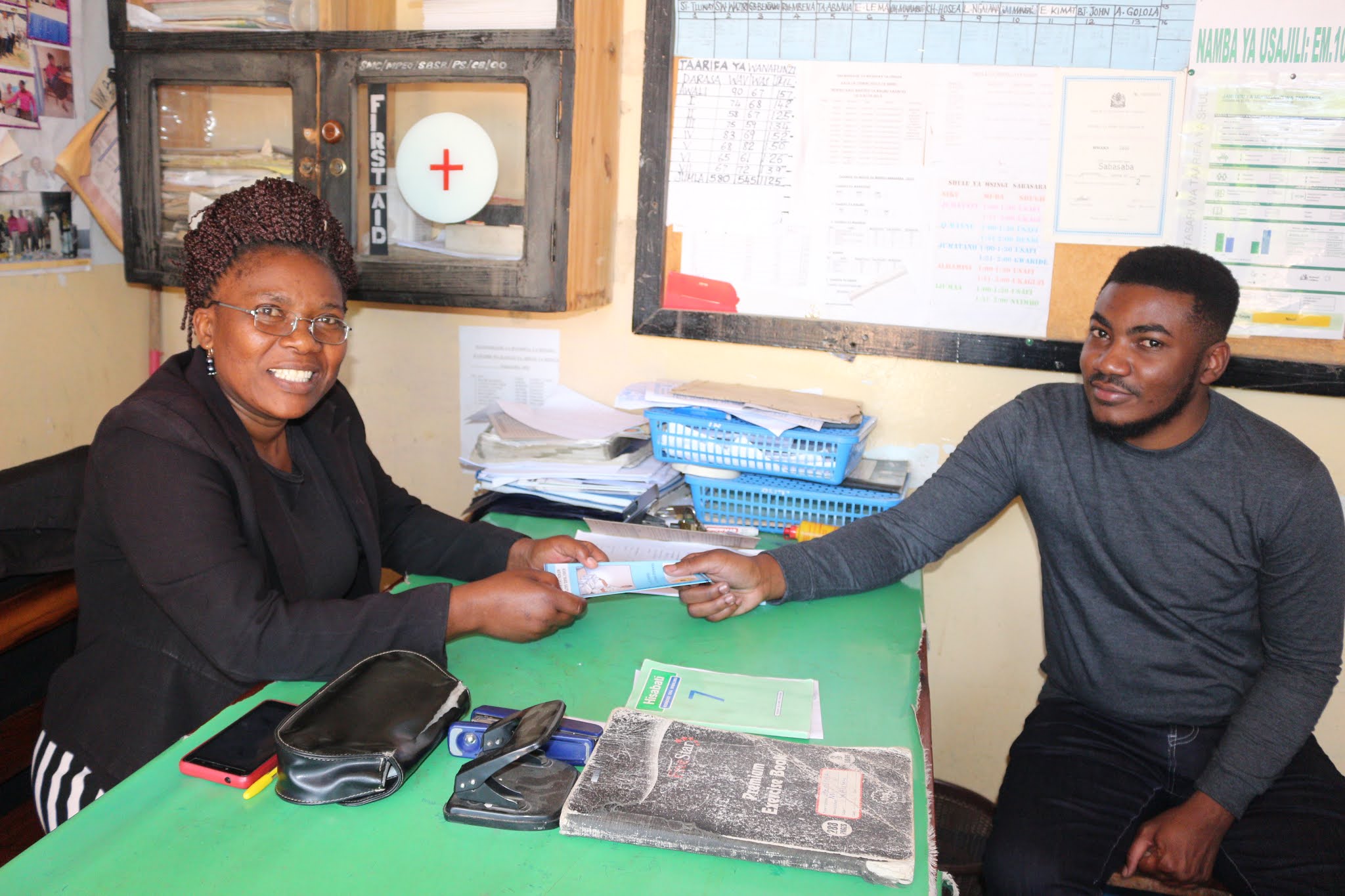 Afisa Utawala wa Shirika hilo, Loveness John akimkabidhi vipeperushi hivyo Mkuu wa Shule ya Sekondari ya Senge, Benjamin Mayengera kwa niaba ya walimu wa shule hiyo.
