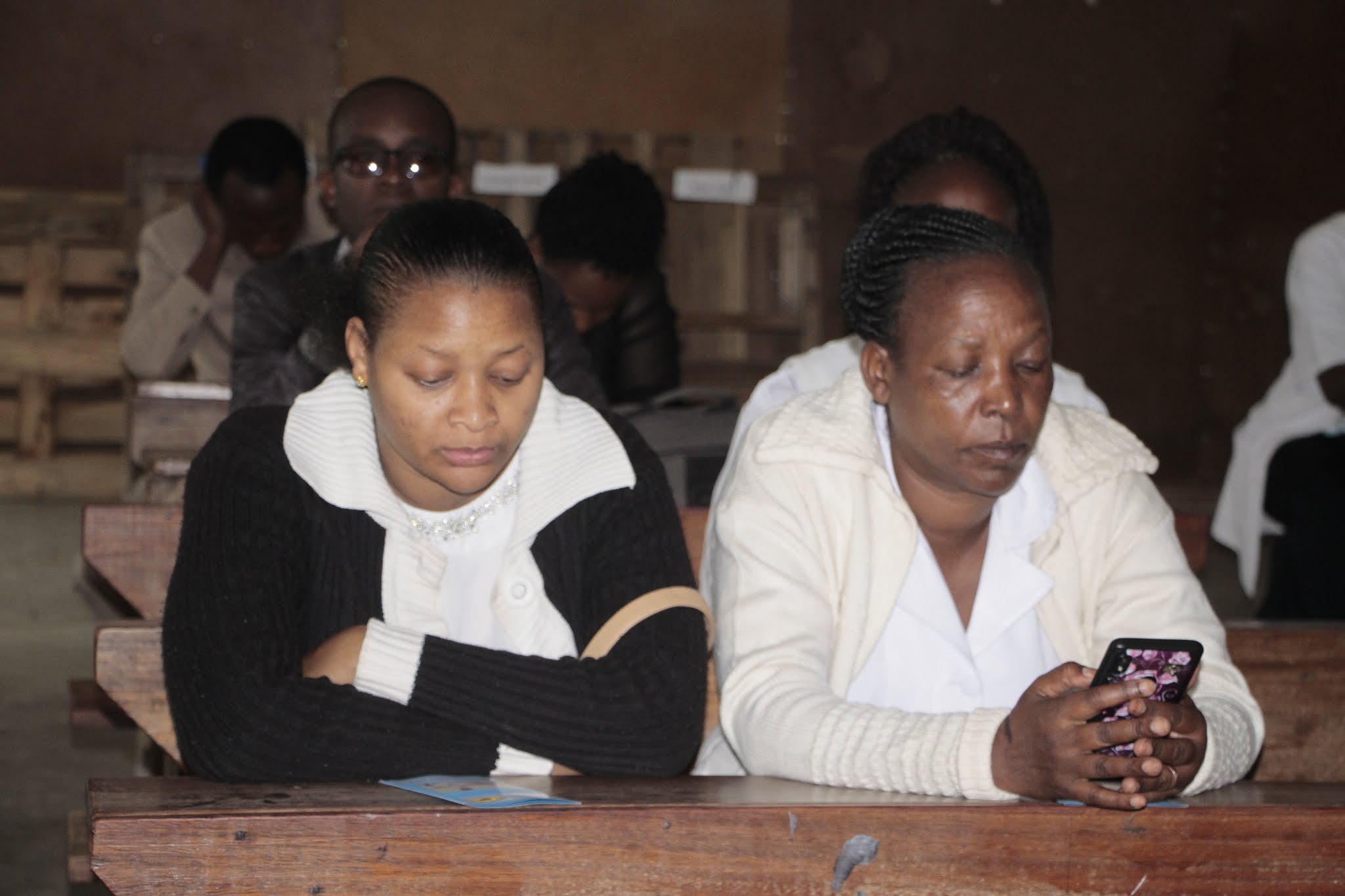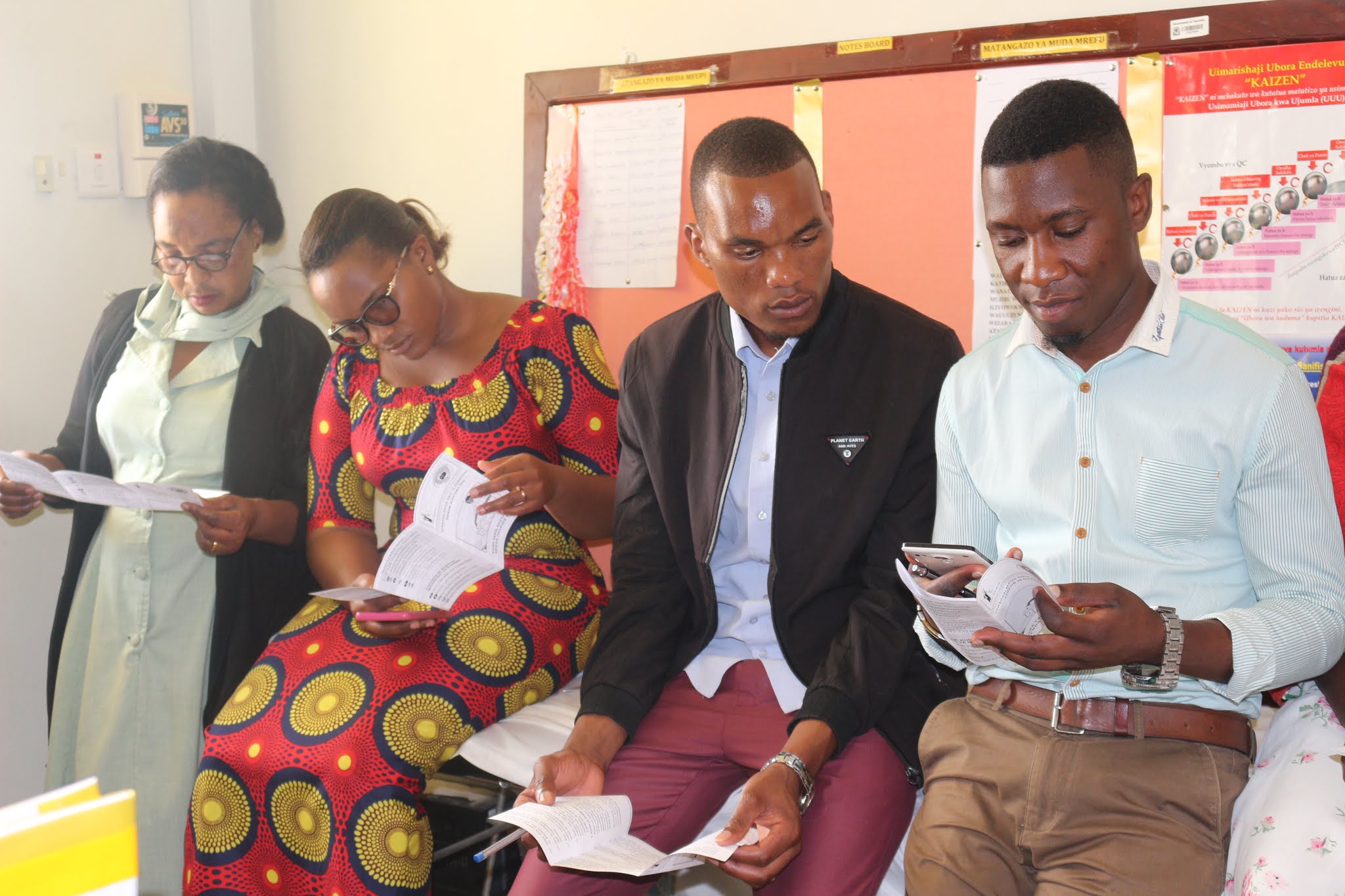 Watumishi wa Hospitali ya Rufaa ya Mkoa wa Singida (Mandewa) wakiangalia vipeperushi vya Shirika hilo vinavyoelekeza kanuni za uchaguzi.