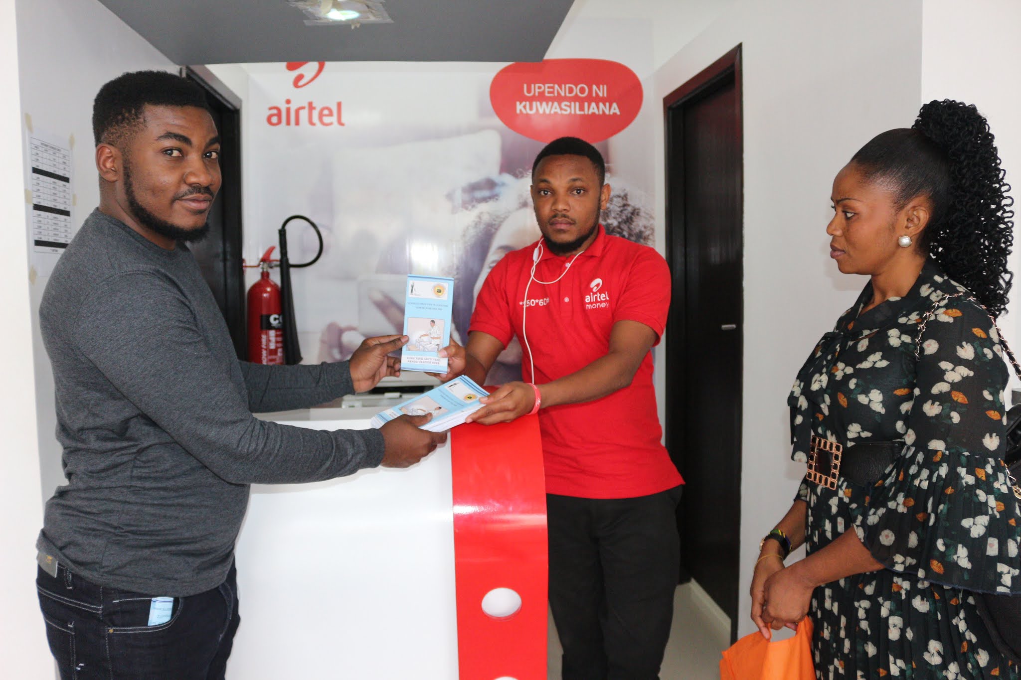 Afisa Tathmini na Ufuatiliaji wa Shirika lisilo la Kiserikali la Women Wake-up (WOWAP) Issah Shayo, akimkabidhi vipeperushi hivyo Msaidizi wa Meneja wa Kampuni ya Simu ya Airtel, Remmy Aloyce kwa niaba ya wenzake. Kulia ni Afisa Utawala wa WOWAP, Loveness John.