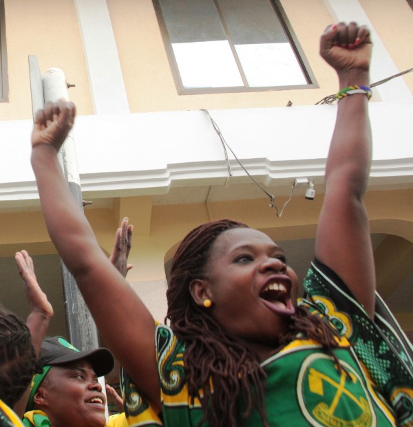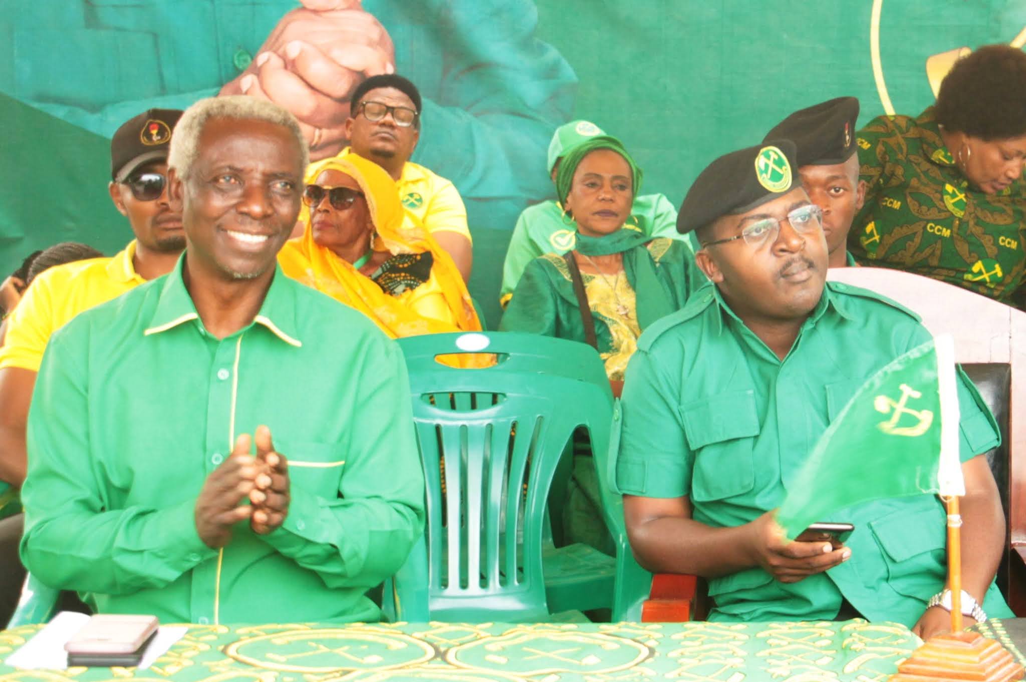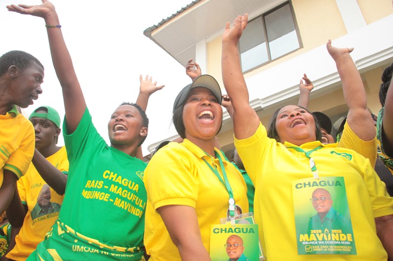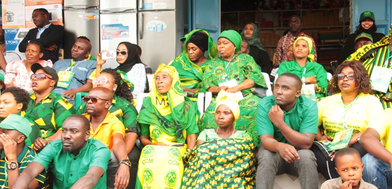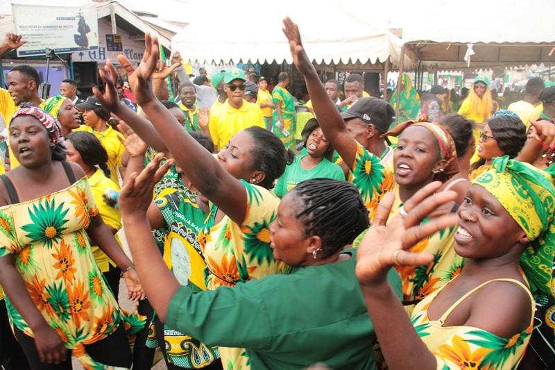 Wafuasi wa CCM wakishangilia baada ya kufurahishwa na kampeni za kueleweka za Mwenyekiti wa UVCCM Taifa, Kheri James akiwaombea kura wagombea wa CCM kwa kuelezea wasifu wao na utendaji kazi wao mzuri.