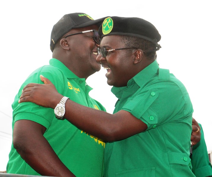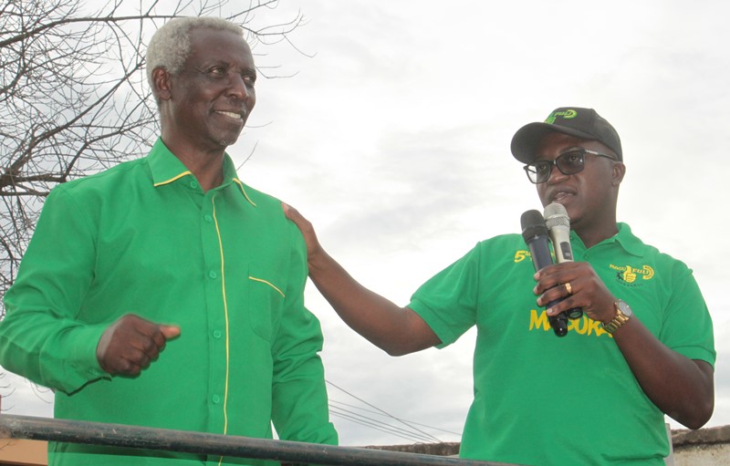 Mgombea Ubunge Jimbo la Dodoma Mjini, Anthony Mavunde (kulia), akimnadi kwa wananchi, Mgombea Udiwani wa Kata ya Madukani, Pro. Mwamfupe.