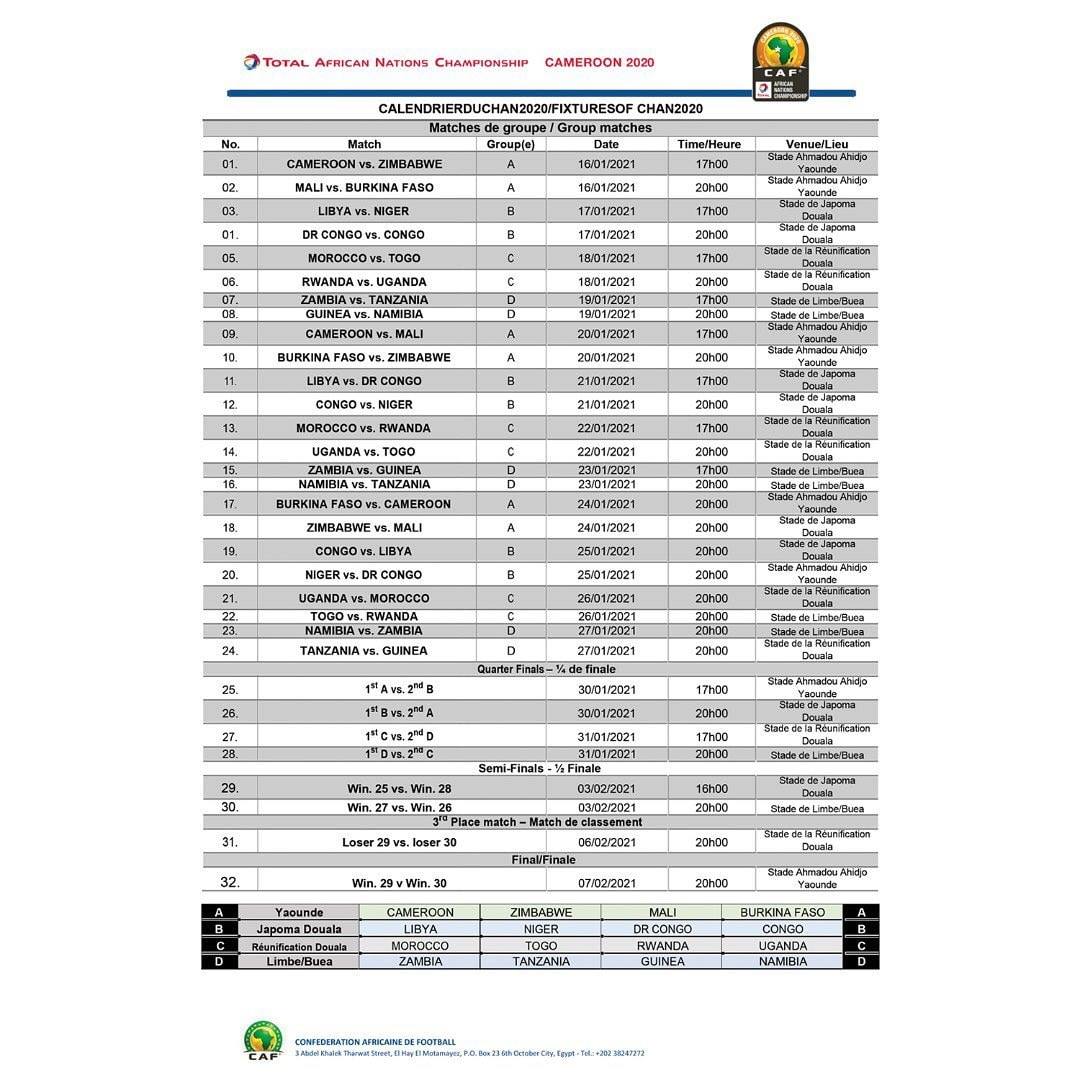 SHIRIKISHO la Soka Afrika (CAF) limetoa ratiba ya Fainali za Ubingwa wa Mataifa ya Afrika zitakazofanyika kuanzia Januari mwakani nchini Cameroon na wenyeji, Simba Wasiofungika watafungua dimba na Zimbabwe Januari 14 Uwanja wa Ahmadou Ahidjo Jijini Yaoundé.