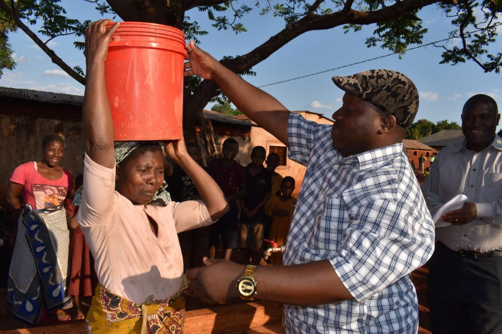 Mkurugenzi wa ununuzi wa ugavi kutoka wizara ya maji Dkt Christopher Nindi kulia,akimtwisha ndoo ya maji mkazi wa mtaa wa Lilambo A Emalisiana Mumba mara baada ya kukagua ujenzi wa mradi mkubwa wa maji uliotekelezwa na wakala wa maji vijijini na mjini Ruwasa na Mamlaka ya maji safi na usafi wa mazingira manispaa ya Songea Souwasa kwa gharama ya zaidi ya shilingi bilioni 1